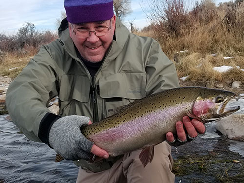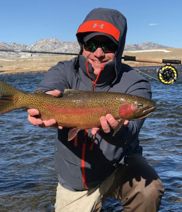 GRA guide Bryant Mettler displays a rainbow trout from Grey Reef Tailwater
